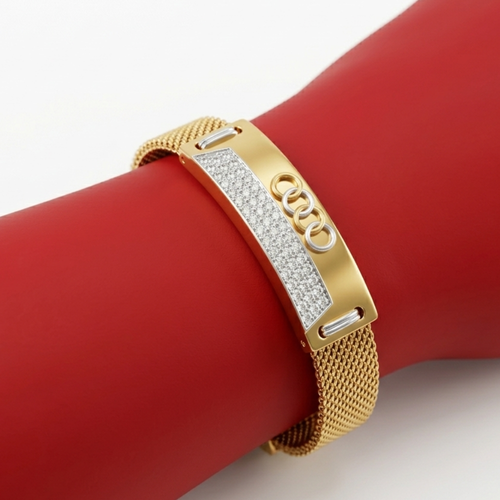 The centerpiece features a curved, satin-finish gold plate that serves as a canvas for two distinct decorative elements. On one side, a dense pavé of shimmering diamonds provides a radiant contrast to the smooth metal. Beside it, a unique three-ring interlocking motif in a two-tone gold and silver finish adds a symbolic touch of connection and unity. Finished with polished silver-toned “staple” accents at the lugs, this piece is the pinnacle of modern, high-end craftsmanship.