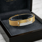 Elevate your wristwear with a design that marries fluid texture with solid architectural brilliance. This statement bracelet is defined by its flexible 22k yellow gold mesh strap, offering a comfortable, fabric-like feel with a high-luxury finish.