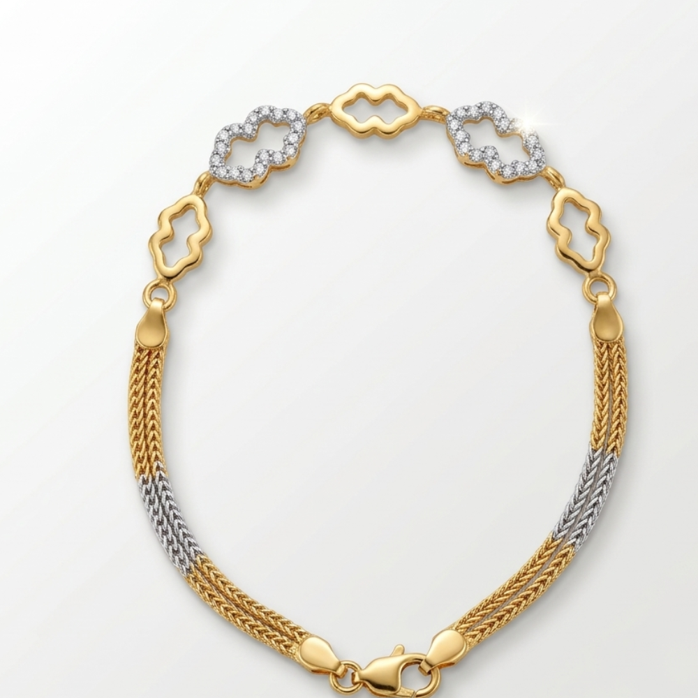 English: Experience the perfect harmony of delicacy and strength with this dual-tone mesh bracelet. The top half is adorned with a sequence of scalloped, cloud-like petal links, alternating between smooth yellow gold and pavé-studded white gold finishes. These links lead into a sophisticated, multi-strand woven mesh band that contours comfortably to the wrist. Its two-tone palette makes it an ideal companion for both gold and silver jewelry, offering a seamless transition from professional office wear to elegant evening attire.