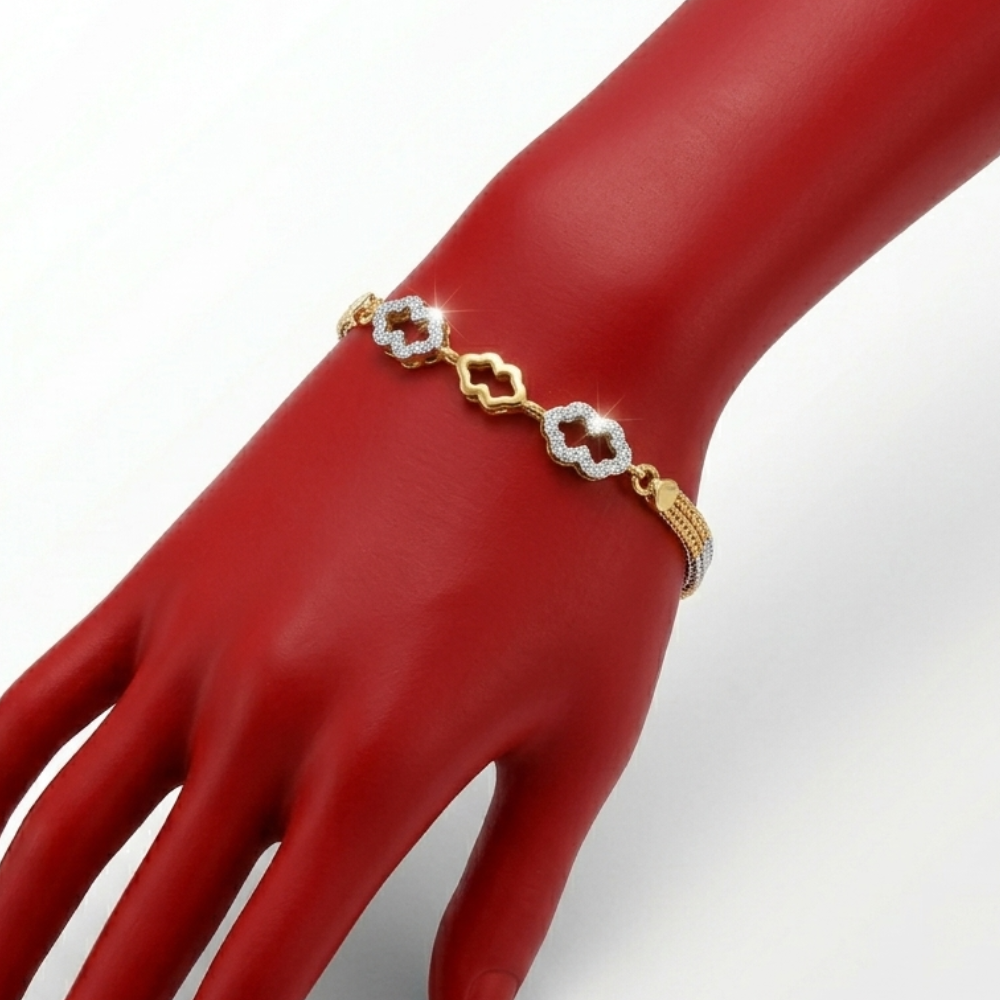Hindi: नक्काशीदार पंखुड़ी और डुअल-टोन मेश ब्रेसलेट