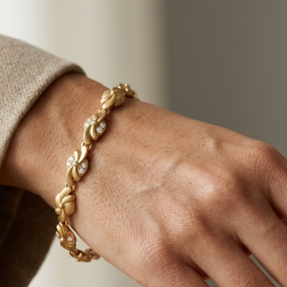English: Elevate your jewelry collection with the artistic elegance of our Satin Petal-Twist Bracelet. This piece reimagines traditional gold-work with a modern, sculptural approach. Each link is meticulously crafted into a swirling petal shape, boasting a refined satin-matte finish that offers a silky touch and contemporary appeal. To add a hint of glamour, alternating links are embellished with three delicate, pavé-set stones that sparkle beautifully against the yellow-gold backdrop. Whether styled with an evening dress or a tailored blazer, this bracelet is a testament to understated luxury.