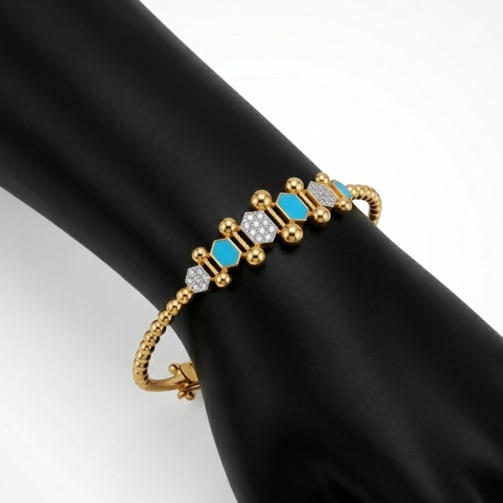 Make a bold statement with this uniquely designed beaded bangle, where modern geometry meets a pop of refreshing color. The centerpiece consists of alternating hexagonal tiles: some filled with a smooth, turquoise enamel and others encrusted with a dense pavé of sparkling stones. These elements are architecturaly framed by polished gold vertical bars, creating a rhythmic and balanced focal point. The band itself is crafted with a continuous sequence of gold beads, providing a shimmering texture that looks beautiful from every angle. This piece is perfect for those who love to blend traditional gold-work with a contemporary, artistic edge.