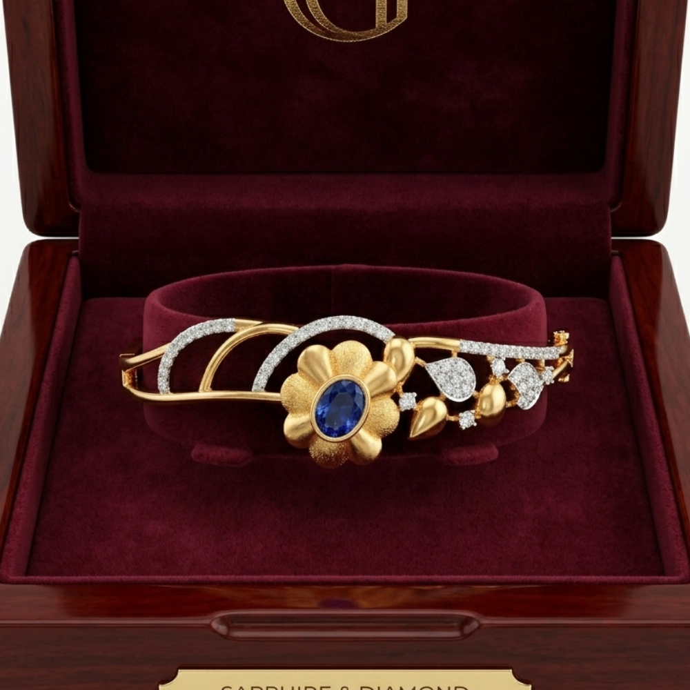 A masterpiece of craftsmanship, this 22k gold bangle features a radiant sapphire-centered flower nestled among sweeping diamond-encrusted curves and delicate leaf motifs. A perfect blend of nature’s beauty and contemporary elegance.