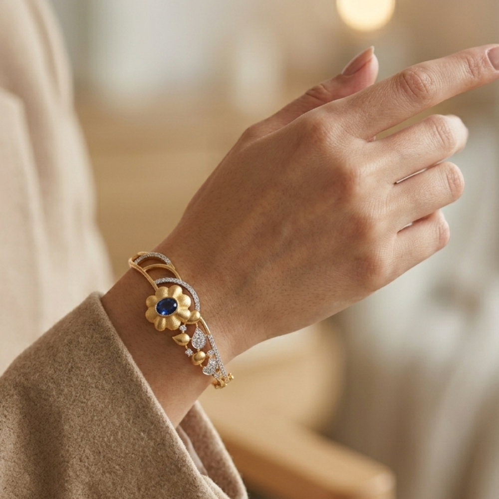 English: Elevate your jewelry collection with this exquisite Azure Bloom Bangle. Designed for the modern woman who appreciates intricate detailing, this piece showcases a central floral motif crafted in brushed and polished gold, highlighted by a vibrant oval-cut blue sapphire.