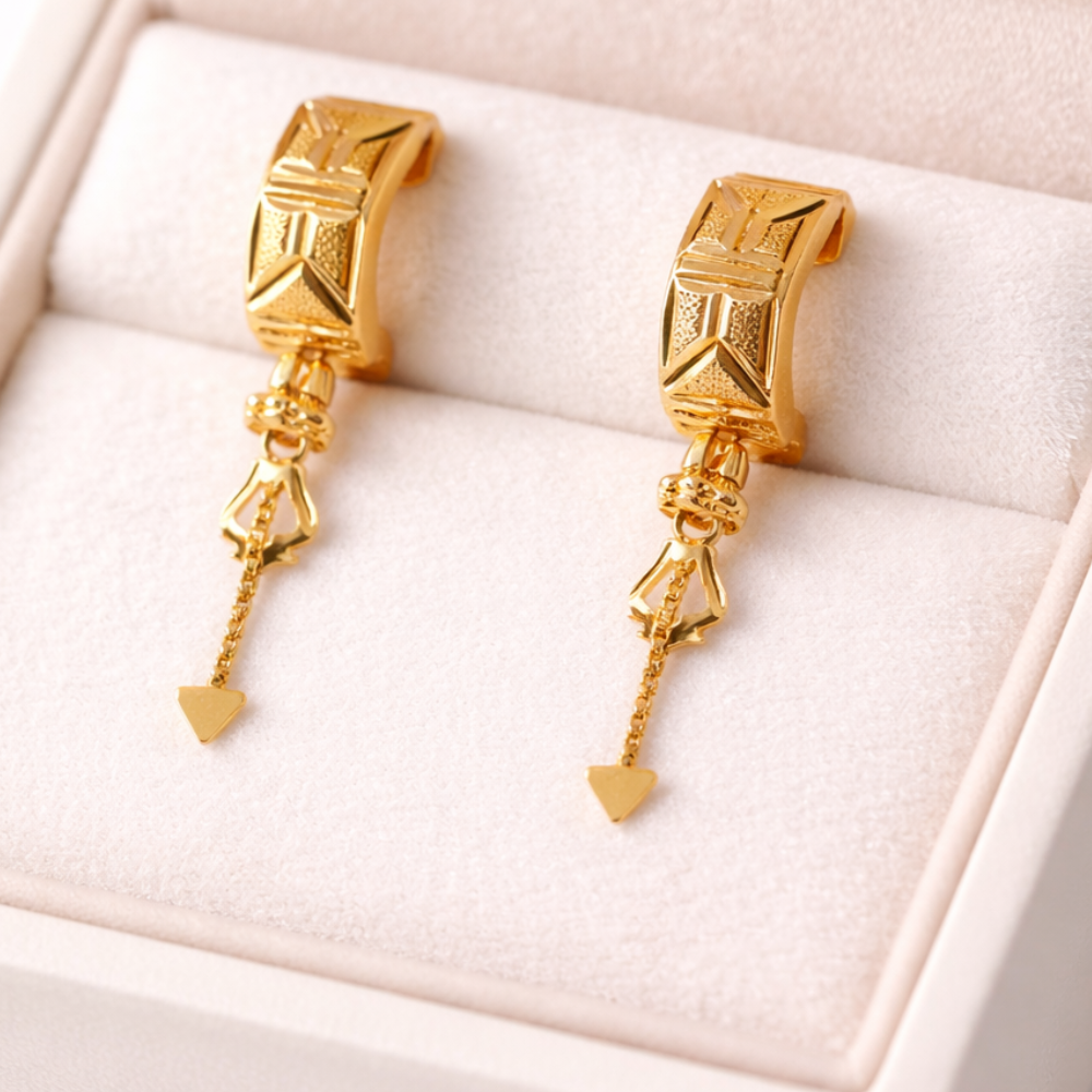 Define your signature style with these Geometric Gold Bali Drop Earrings, where traditional craftsmanship meets architectural boldness. These earrings feature a wide, structured half-hoop (Bali) base adorned with rich textures, leading to an intricate cascading pendant. They are designed for the woman who wants her jewelry to tell a story of heritage, luxury, and modern precision.