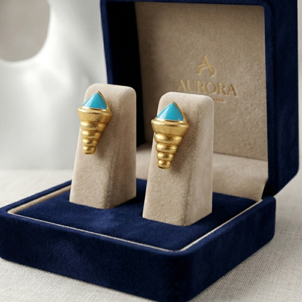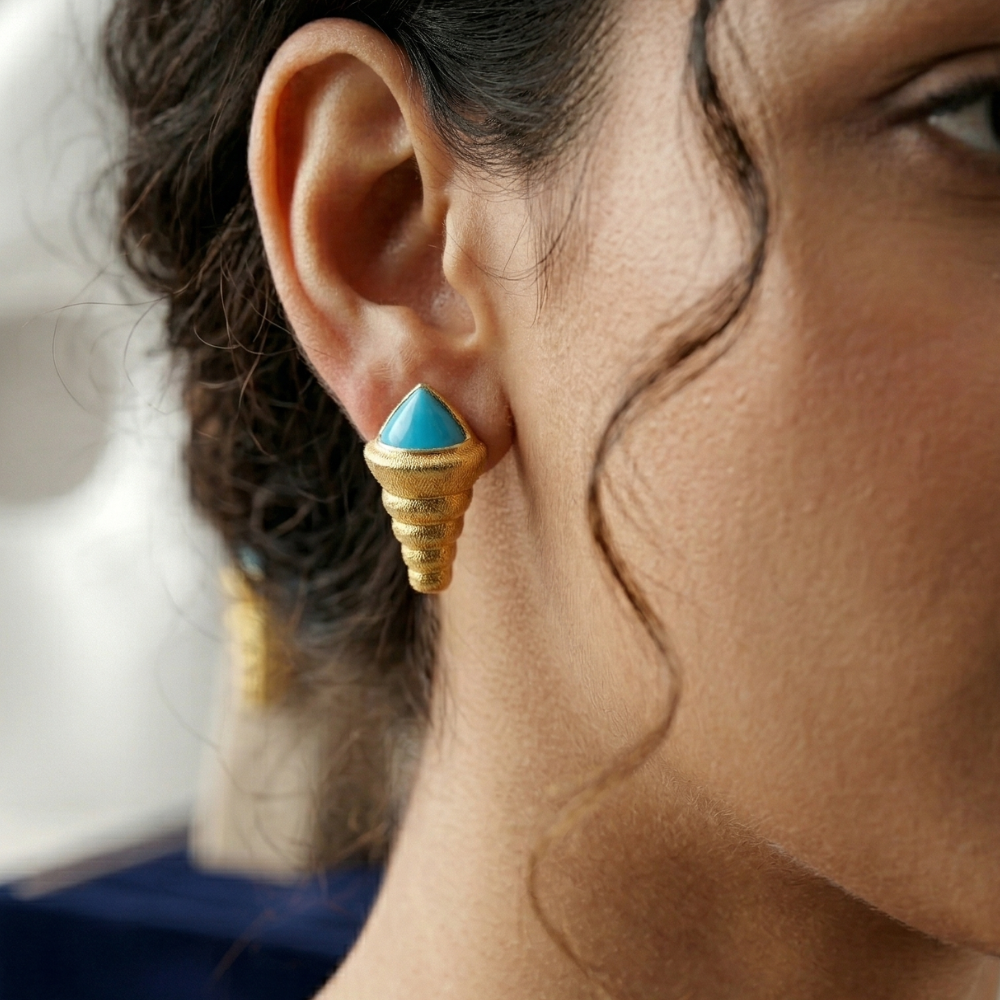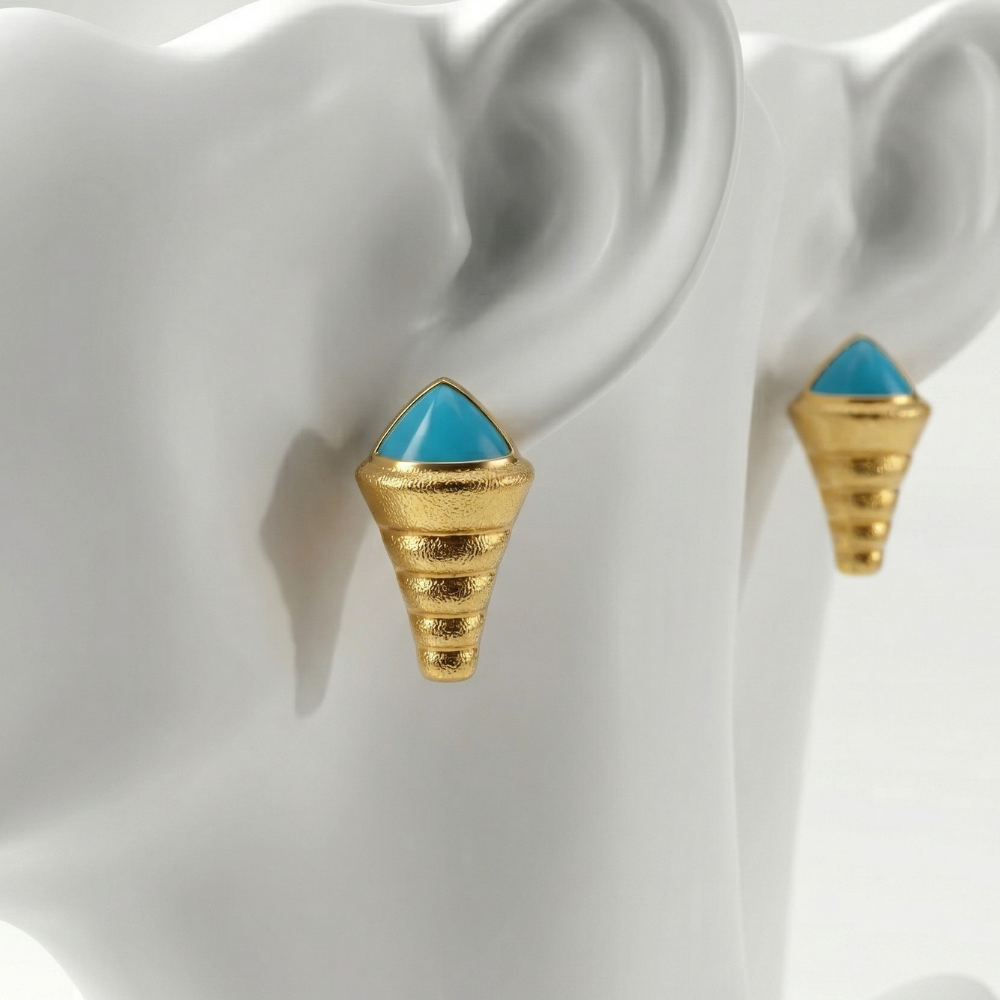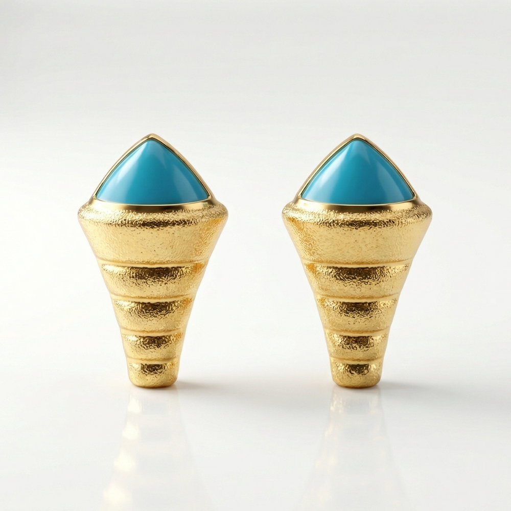 Make a bold artistic statement with these Avant-Garde Turquoise & Textured Gold Conical Studs. Combining tribal-inspired geometry with luxury finishes, these earrings feature a vibrant turquoise-blue cabochon nestled atop a uniquely textured conical base. These are not just earrings; they are wearable art for the fashion-forward individual.