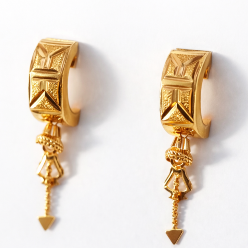 Product Overview Make a statement with these Royal Geometric Gold-Plated Bali Drops. These earrings feature a wide, structured half-hoop base adorned with rich 3D textures, leading to a stunning multi-tiered pendant.