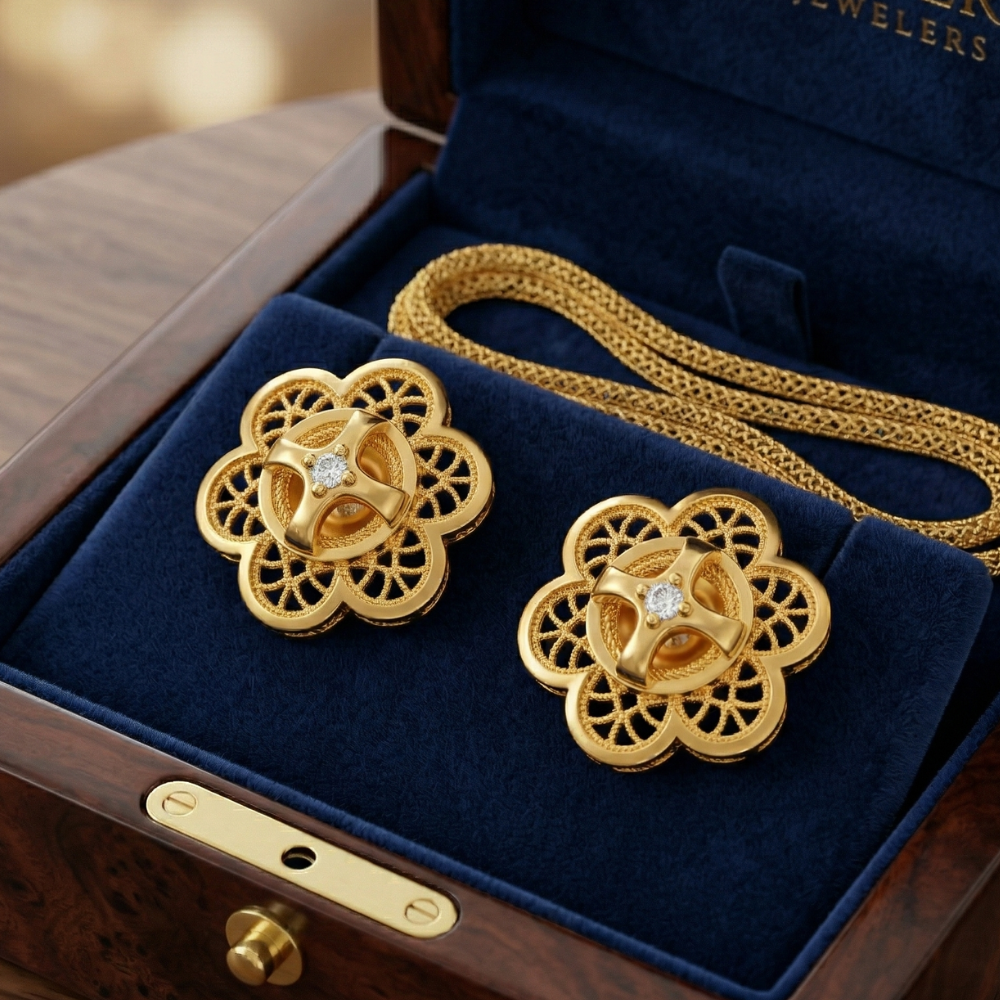 • Intricate Golden Filigree: The central diamond-shaped frame is crafted with a complex, grid-like filigree pattern. This “Rawa” inspired texture adds significant depth and a touch of traditional charm.