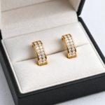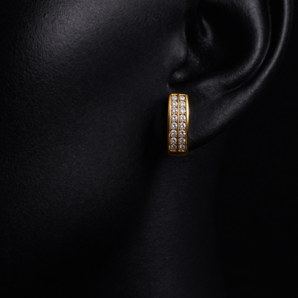 Product Overview Command attention with these Pave-Set Gold Rectangle Studs. Featuring dual columns of precision-set crystals within a thick golden frame, these earrings represent the pinnacle of corporate luxury and refined power.