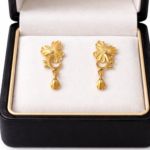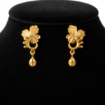 • Intricate Beaded Links: A structured golden chain adorned with polished spheres connects the ornate circular stud to the main drop.