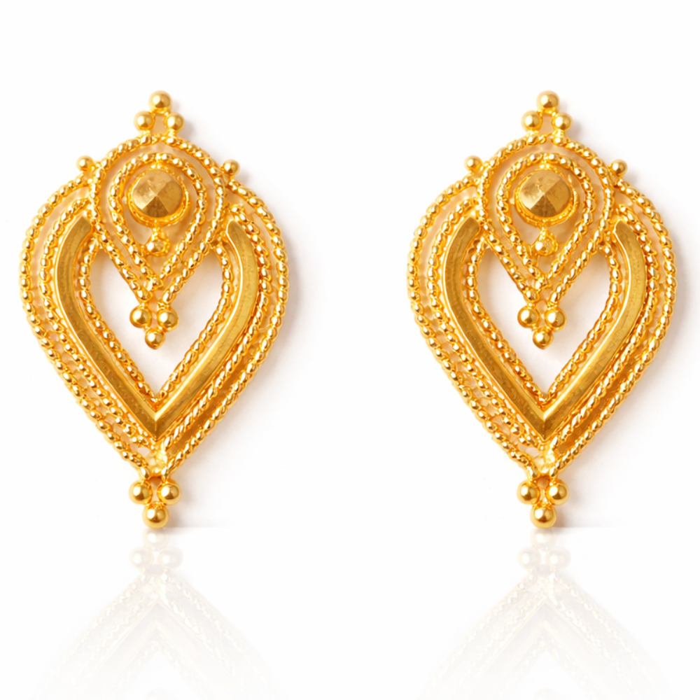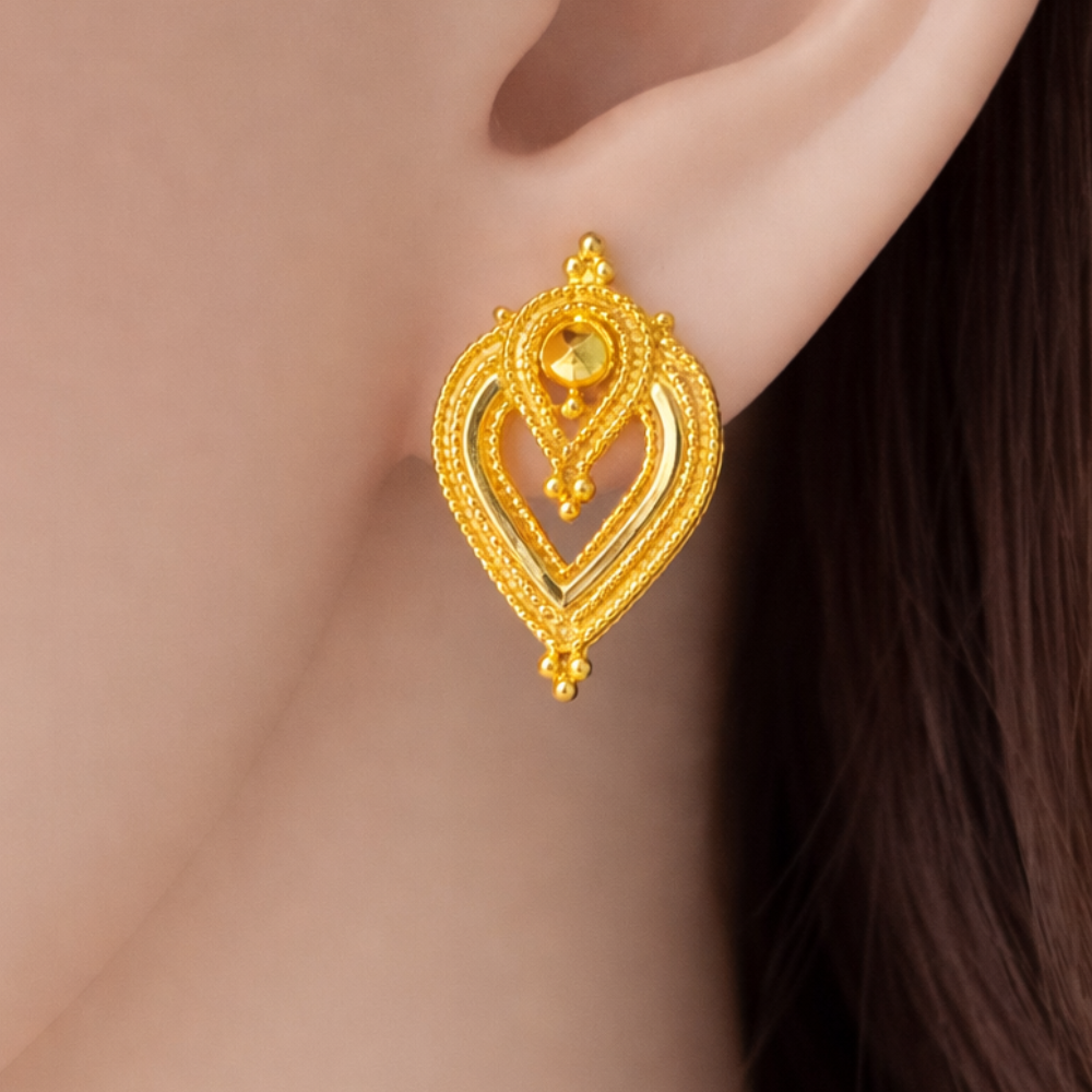 Intricate Beaded Links: A structured golden chain adorned with polished spheres connects the ornate circular stud to the main drop.