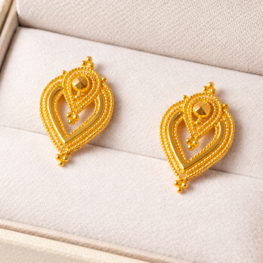 Product Overview Redefine minimalist luxury with the Sculpted Vortex Gold Studs. Featuring a captivating spiral pattern, these earrings represent fluid movement and architectural strength, making them a versatile staple for any wardrobe.