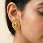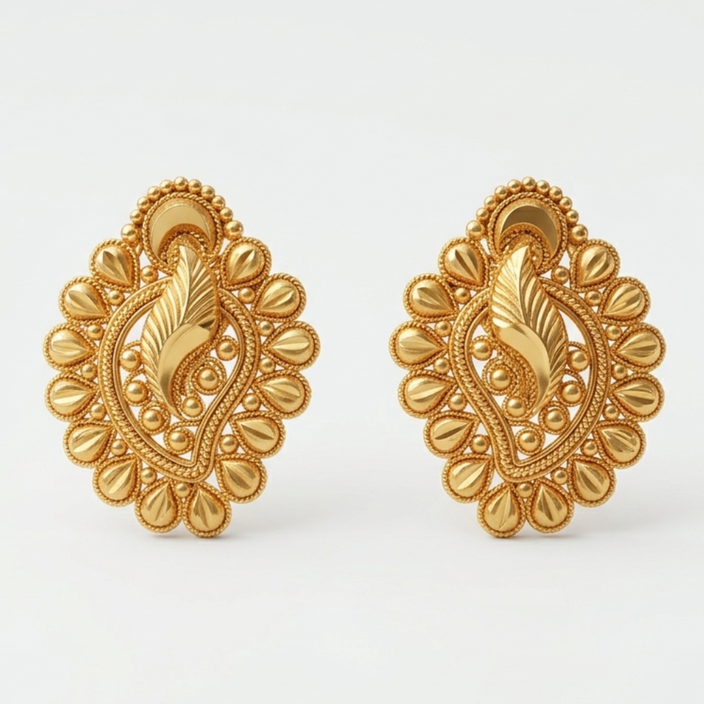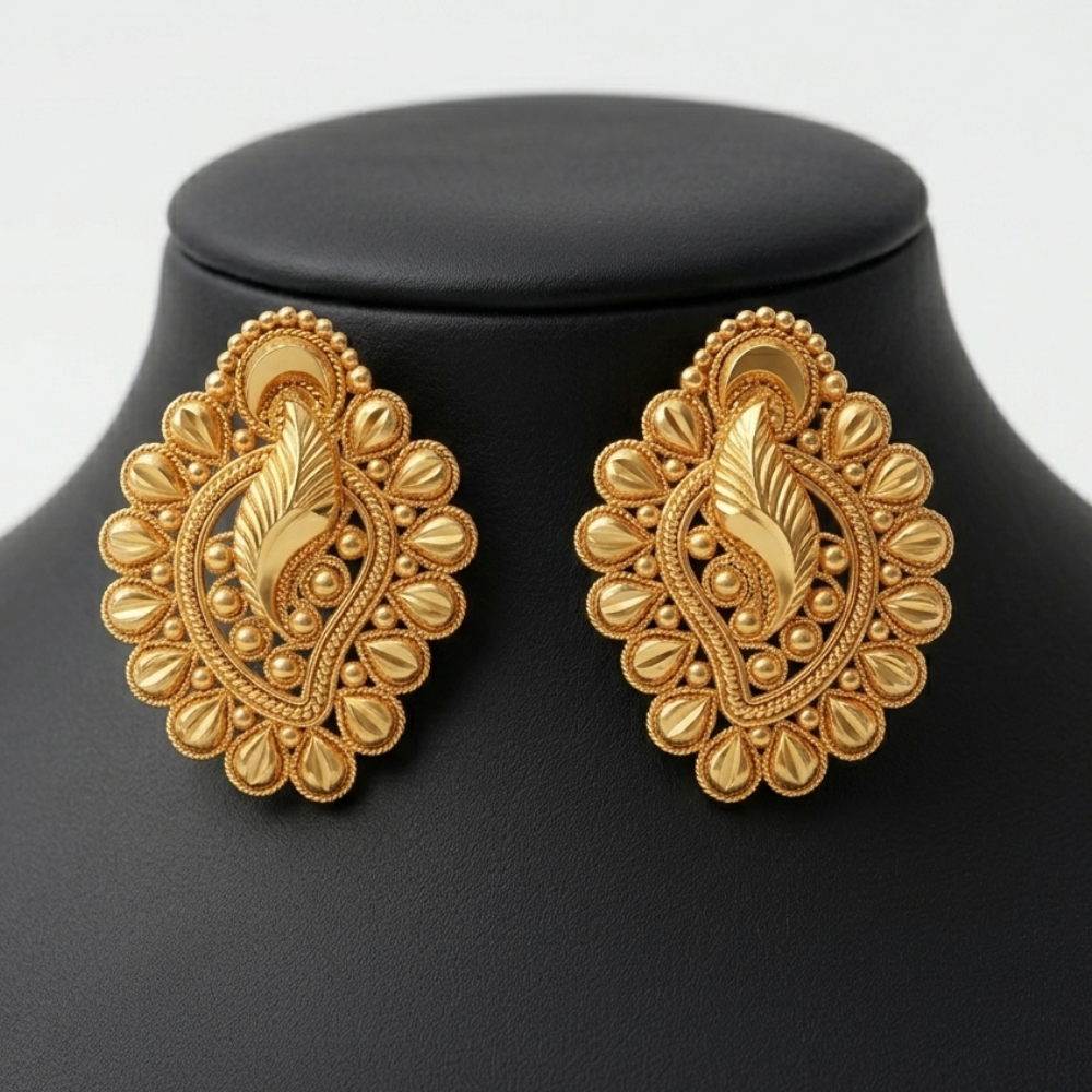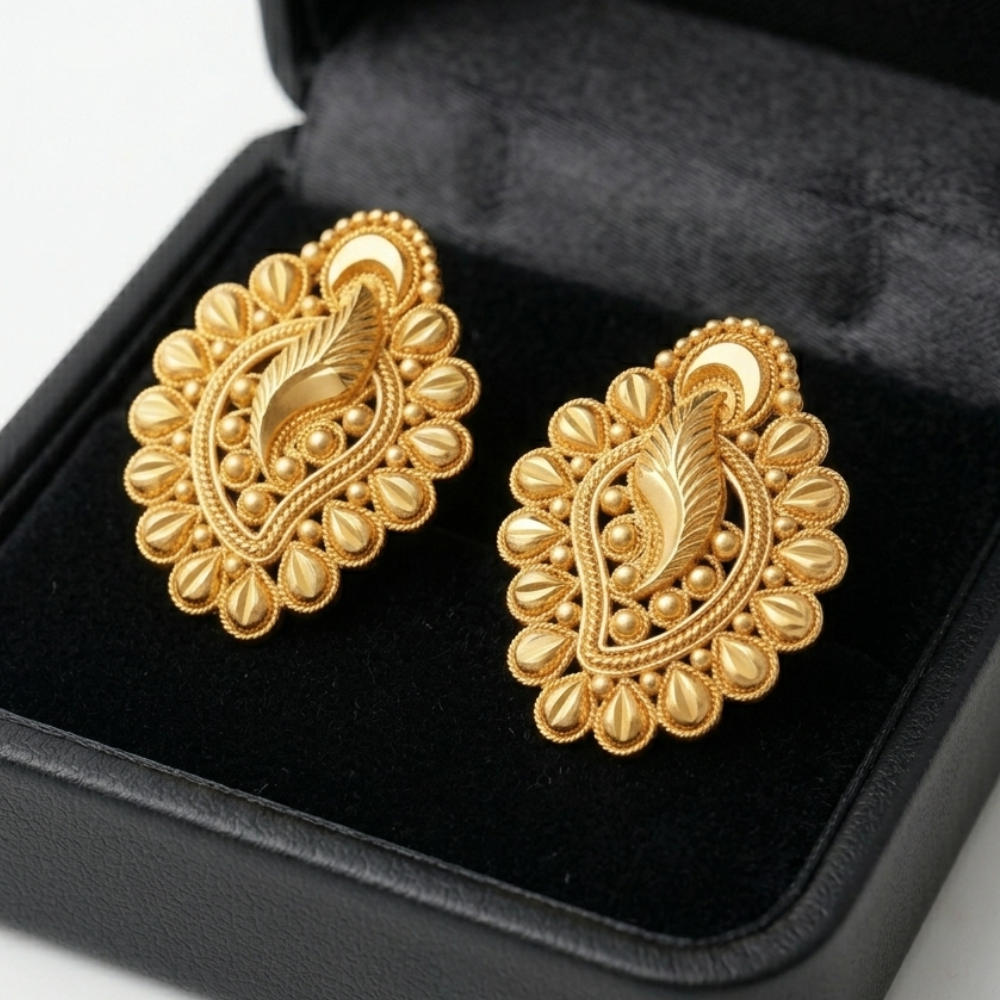 Product Overview Experience the intricate beauty of the Majestic Paisley Leaf Studs, a design that combines the timeless Paisley (Kalki) shape with rich, textured metalwork. These statement earrings are designed to provide a royal aesthetic for high-end traditional events.