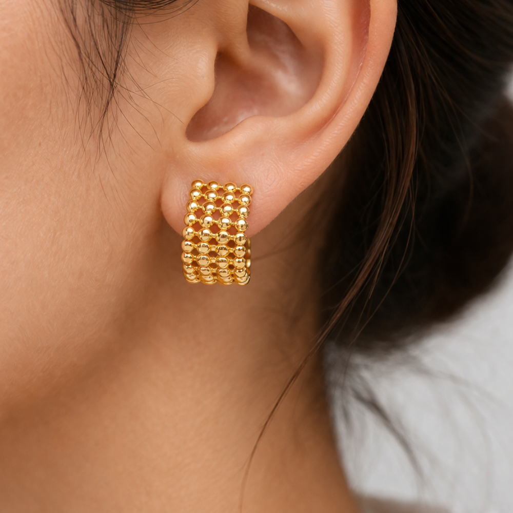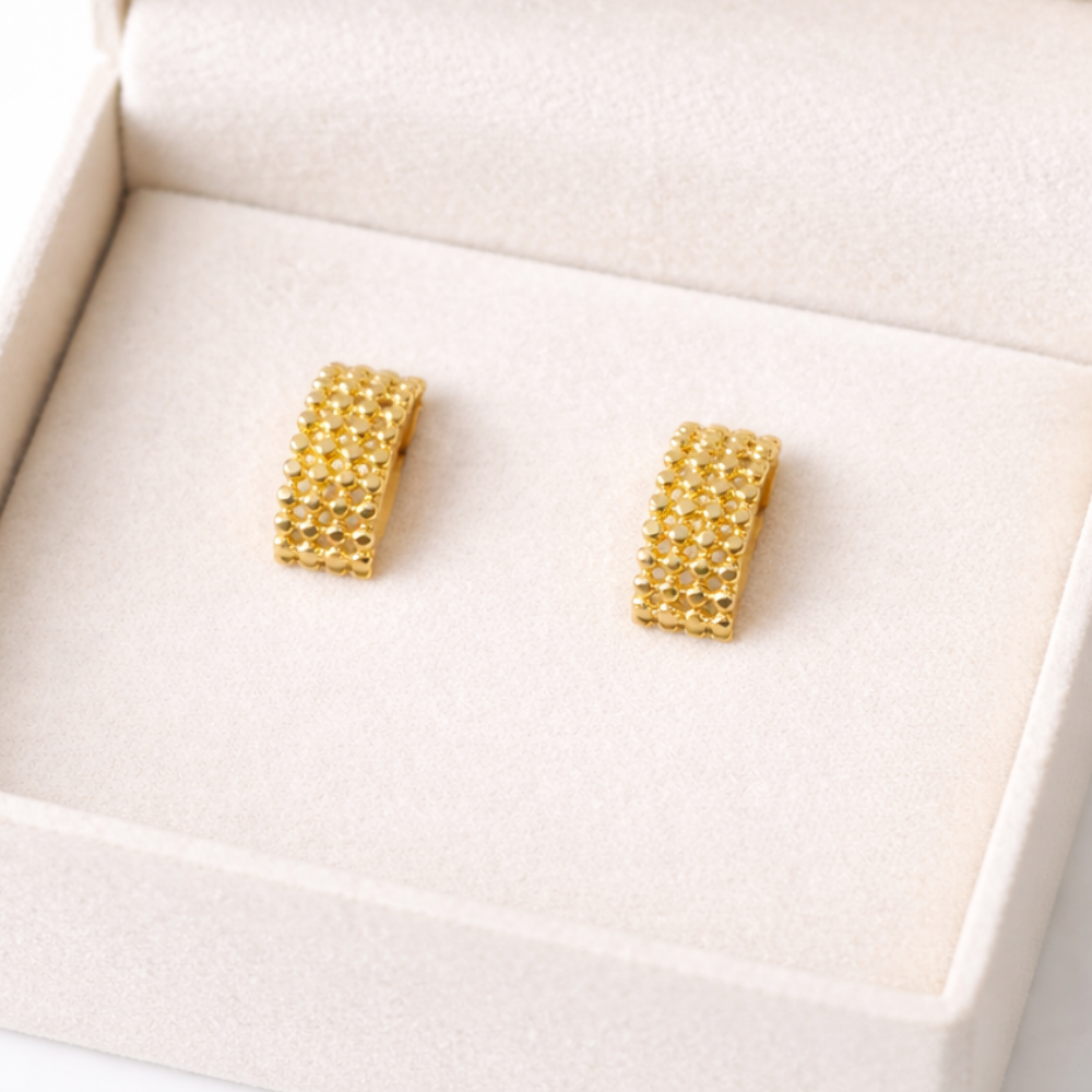 These Golden Granulated Mesh Hoop Earrings are a stunning blend of traditional craftsmanship and contemporary flair. Featuring a broad, semi-hoop silhouette, the design is defined by an intricate grid of raised gold beads. This “granulated” texture creates a rich, tactile surface that catches the light from every angle, offering a radiant glow.