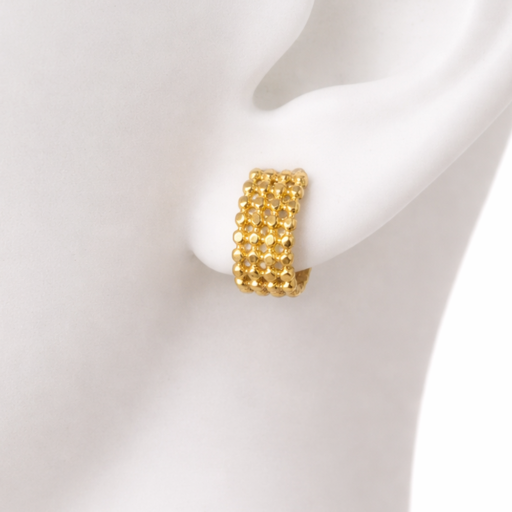 • Design: Wide semi-hoop with a repetitive beaded mesh pattern.