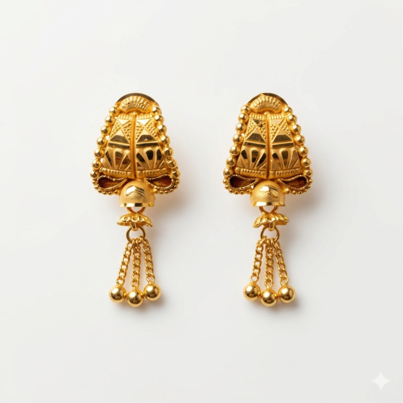 Apne ethnic wardrobe ko ek naya aur shandaar roop dein in Traditional Gold Drop Earrings ke saath. Ye earrings bharatiya parampara aur modern design ka ek adbhut sangam hain. Inka intricate texture aur niche latakta hua pyara heart (dil) shape ka pendant inhe behad attractive aur feminine banata hai. Ye un logo ke liye perfect hain jo jewelry mein thoda heavy aur detail-oriented kaam pasand karte hain.