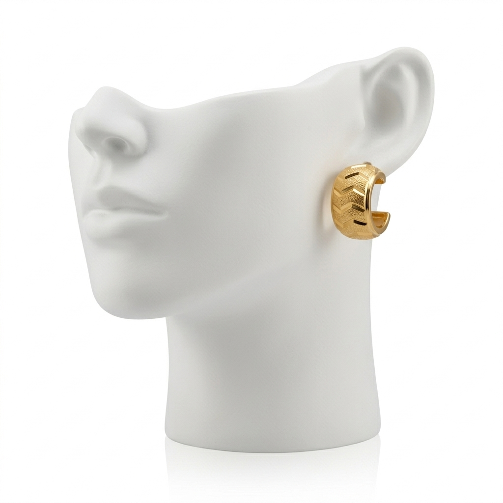 Their compact, semi-hoop shape ensures they sit elegantly against the earlobe, making them an ideal choice for the modern woman who values both style and practicality. With their warm gold radiance and timeless pattern, these earrings are a versatile addition to any jewelry collection.