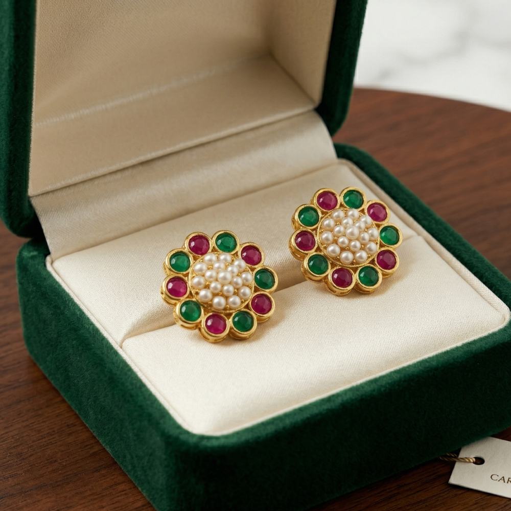 Product Description: Royal Heritage Pearl & Navratna-Style Floral Studs