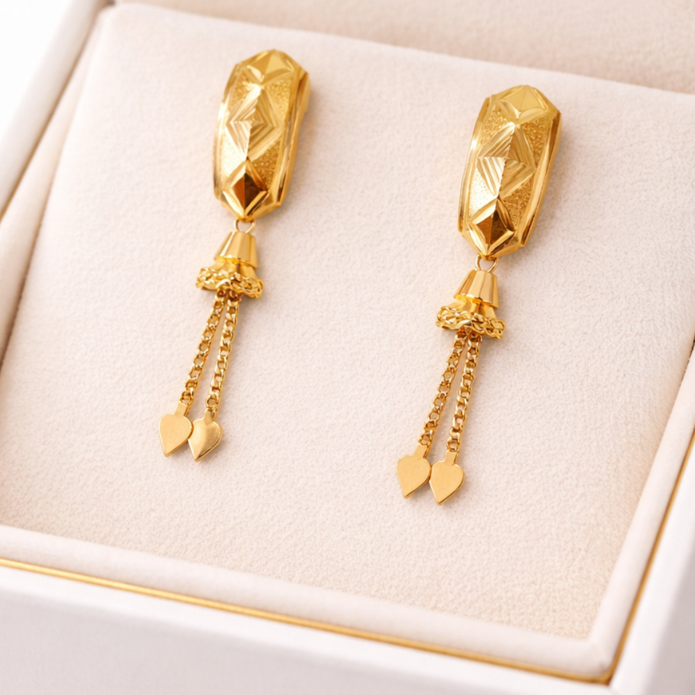 Product Description: Golden Geometric Tassel Drop Earrings with Heart Charms