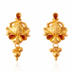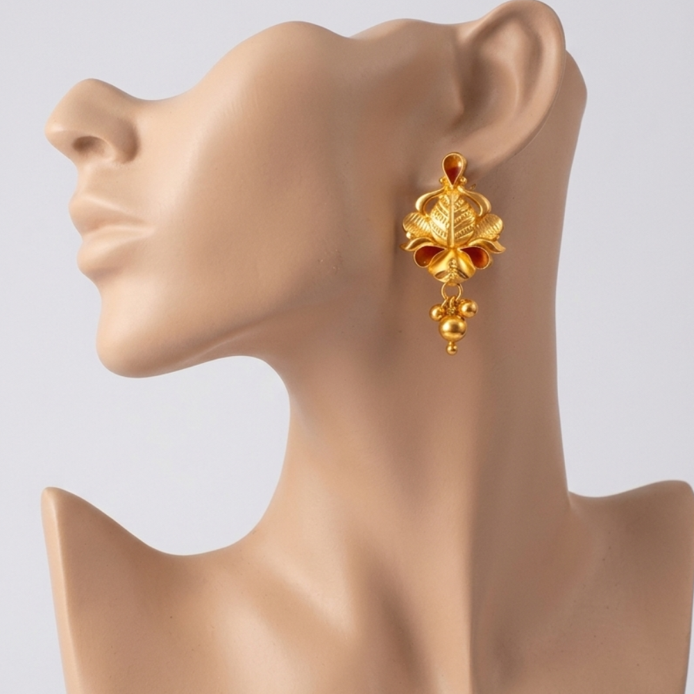 Graceful Jhumki Cluster: Suspended from the floral base is a cluster of three smooth golden beads. This “tri-drop” arrangement provides a subtle chime and classic movement.
