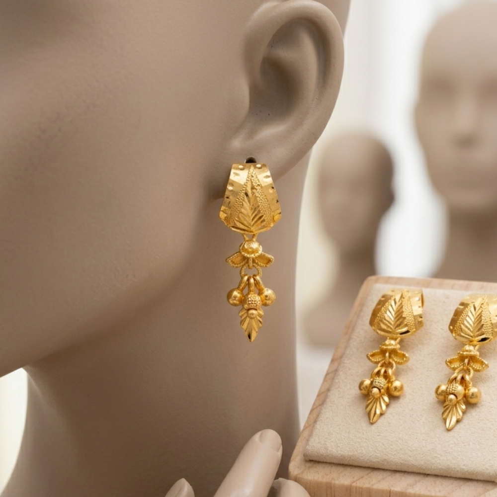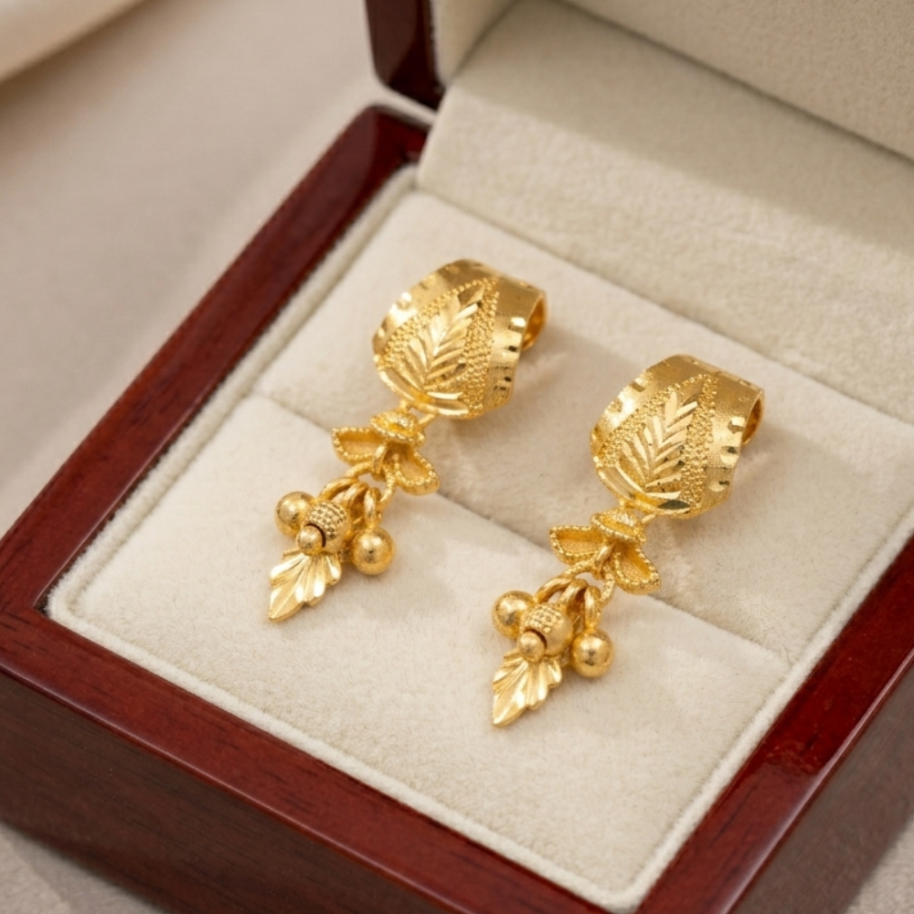 Traditional Motifs: Includes sculpted floral patterns, majestic sun-burst dome studs (Topes), and traditional leaf-inspired danglers.