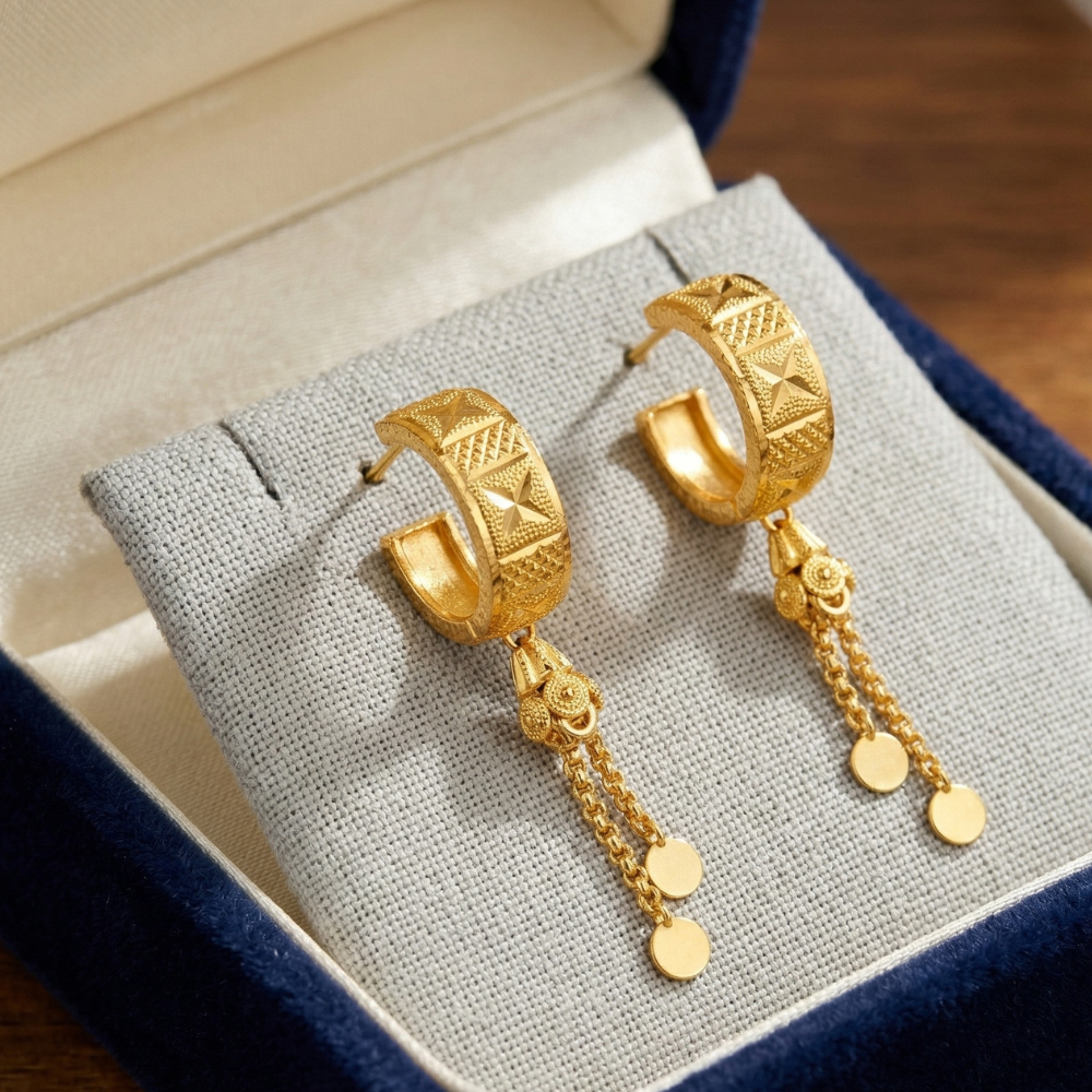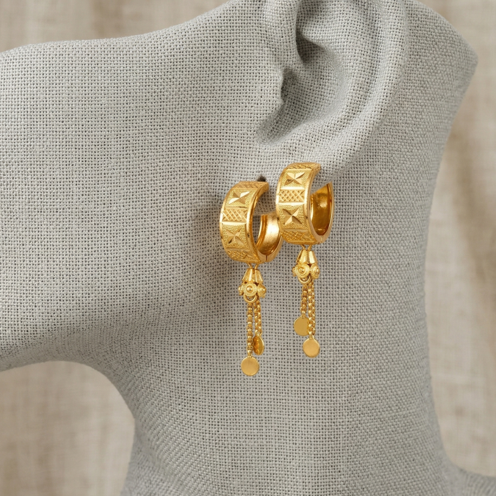 Intricate Geometric Carving: The main hoop features detailed 3D geometric patterns and textured “Rawa” work, giving it a rich, antique gold look that sparkles from every angle.