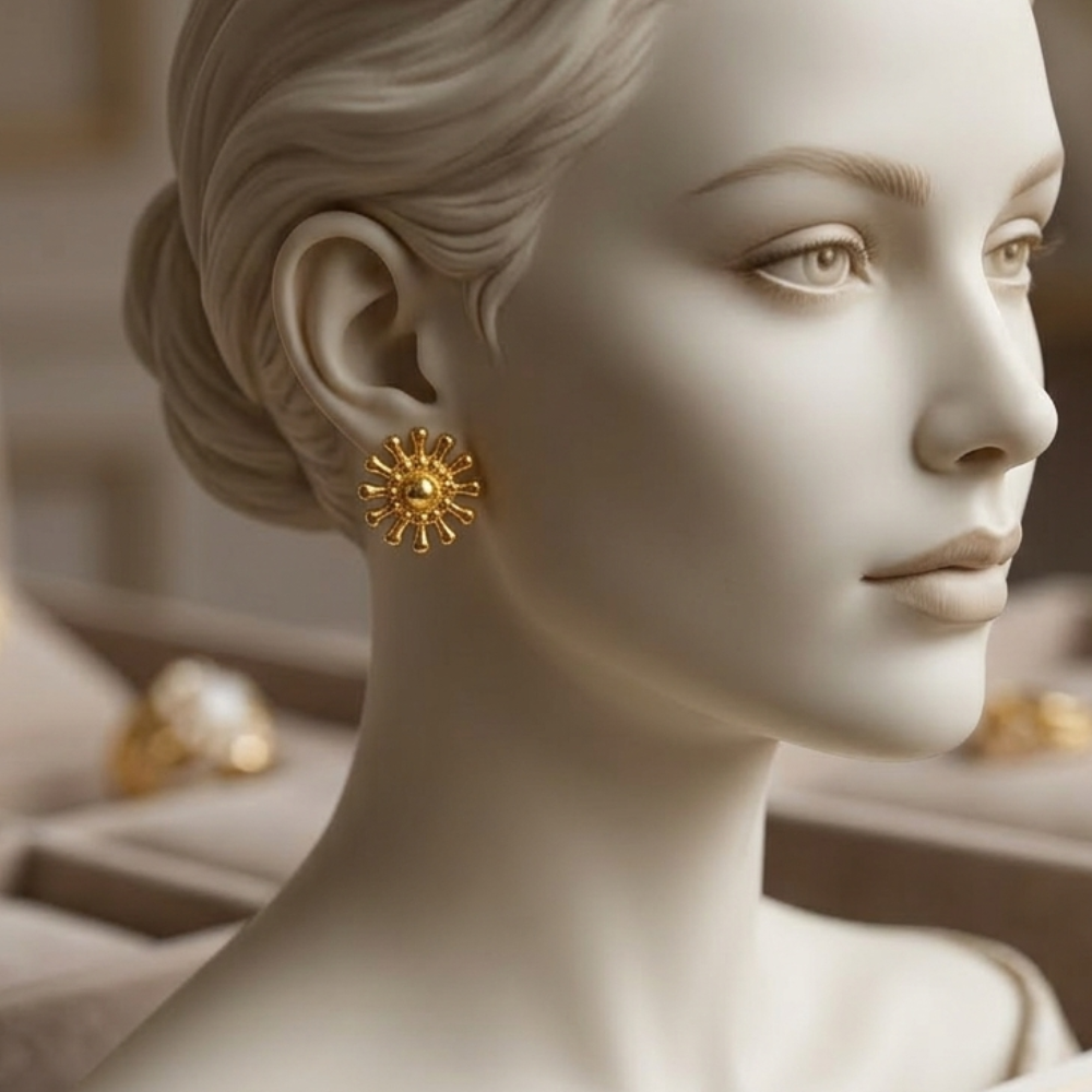 Embrace the warmth and energy of the sun with our Radiant Solstice Sun Studs. These earrings are a masterclass in geometric elegance, featuring a bold central dome surrounded by a ring of delicate granulation beads and twelve polished radiating spokes.