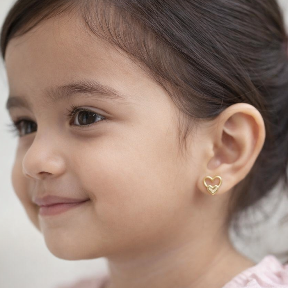 Modern romance meets minimalist design in the Amora Dual-Heart Petite Studs. These charming earrings offer a fresh perspective on the classic heart silhouette, featuring a unique nested design. A delicate, hollow golden outline frames a tiny, solid puffed heart at its base, creating a sense of balance and depth.