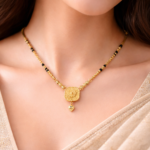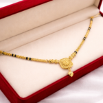 This ornate Mangalsutra is the perfect accompaniment to rich ethnic wear. Pair it with a Banarasi silk saree or a heavily embroidered salwar suit to let the gold craftsmanship shine. Its unique heart drop also makes it a lovely choice for modern celebratory events, where it can be styled with an Indo-western gown for a fusion look that bridges heritage and romance.
