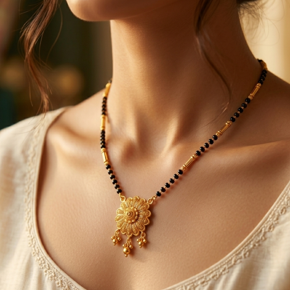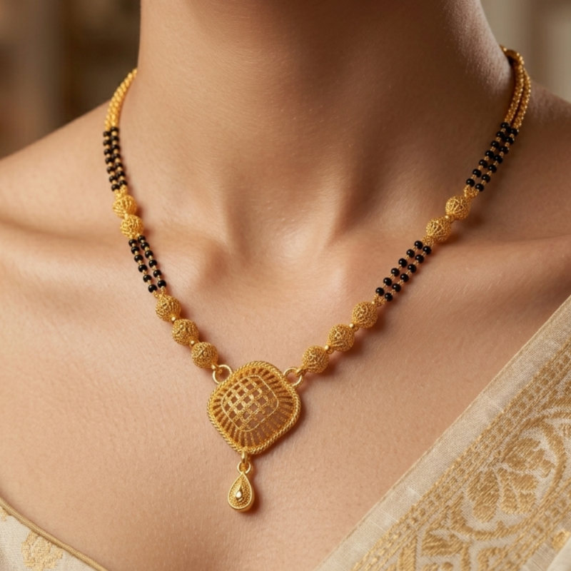 This opulent Mangalsutra is the perfect crowning jewel for grand festive occasions and weddings. It pairs exceptionally well with rich Kanjeevaram or Banarasi silk sarees, as the intricate gold-work complements the heavy zari borders of traditional textiles. To keep the focus on the pendant, style it with simple gold studs or matching filigree jhumkas for a complete, curated look.