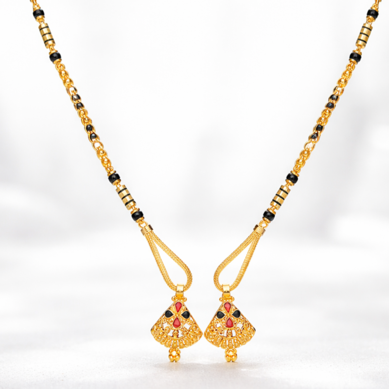 Embrace a perfect harmony of tradition and delicate craftsmanship with this yellow gold Mangalsutra. Designed for the woman who appreciates subtle elegance, this piece features a unique “V-shaped” drop silhouette that offers a graceful, elongated look.