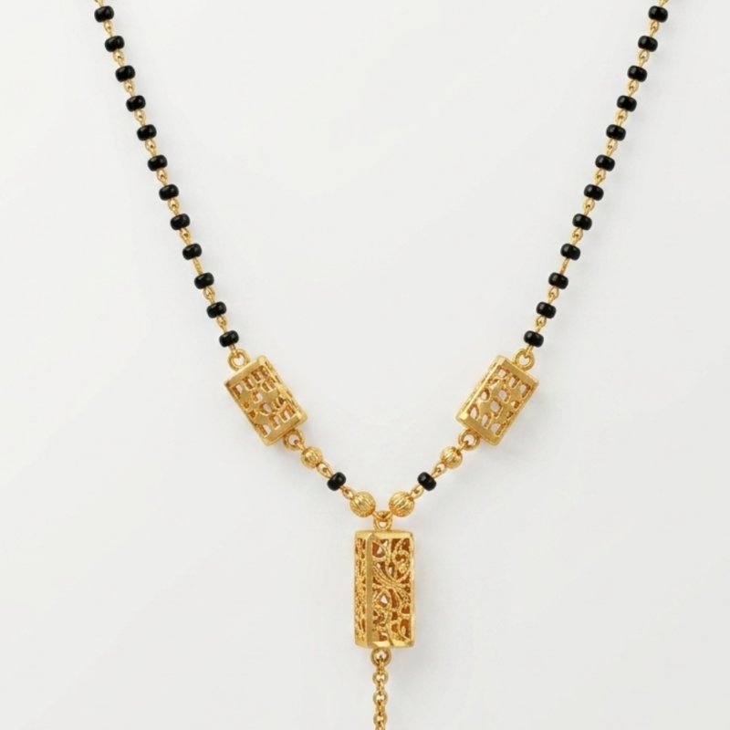 Exude regal charm with this stunning 22k yellow gold Mangalsutra, a piece that beautifully bridges the gap between heritage artistry and grand design. This necklace is crafted for the woman who loves the intricate storytelling of traditional Indian jewelry.
