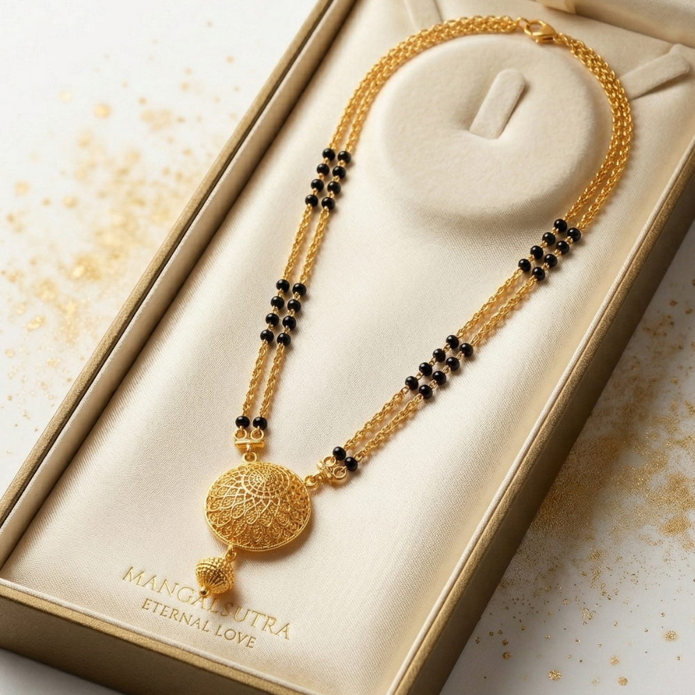 This ornate Mangalsutra is best paired with traditional attire such as a rich Kanjeevaram saree, a Banarasi silk drape, or an embroidered Anarkali suit. Its double-layered chain makes it stand out against broad necklines, serving as the primary statement accessory for festive occasions.