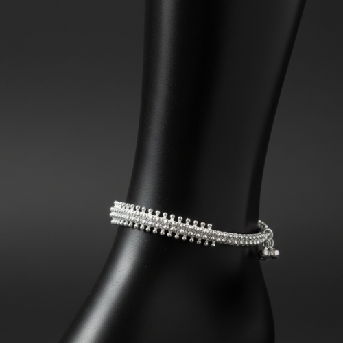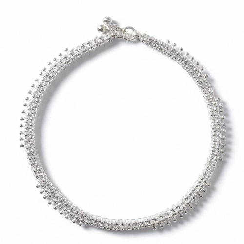 Accented with vibrant, bead-cut synthetic rubies and emeralds, this anklet brings a touch of royal Indian heritage to a contemporary silhouette. The delicate silver “ghungroo” bells add a whisper of sound and a graceful finish to every step.