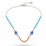This stylish anklet features a multi-colored beaded design set on a delicate silver-finish chain. It is centered around the protective “Nazar” (Evil Eye) charm, making it both a meaningful talisman and a trendy accessory.