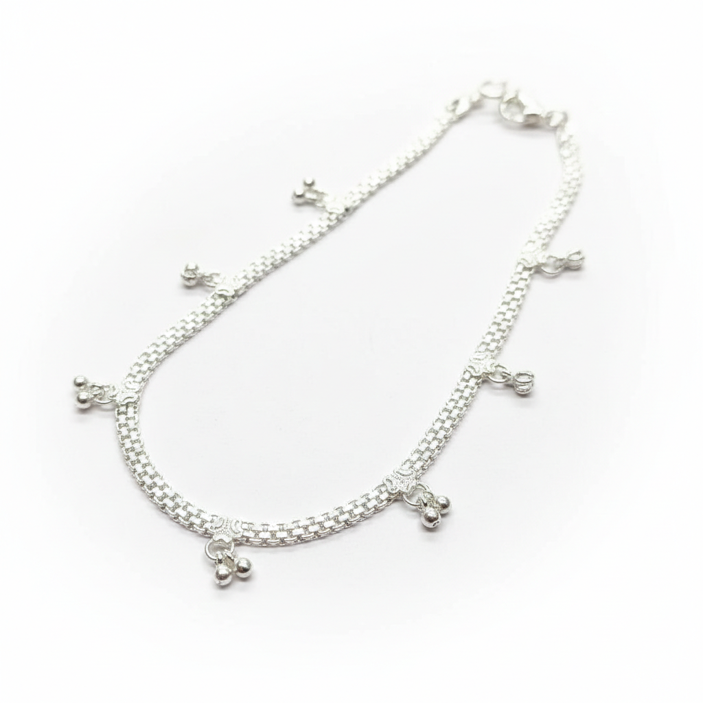 Triple-Layered Design: Features three distinct rows of intricate silverwork, giving it a rich, broad appearance that covers the ankle beautifully.