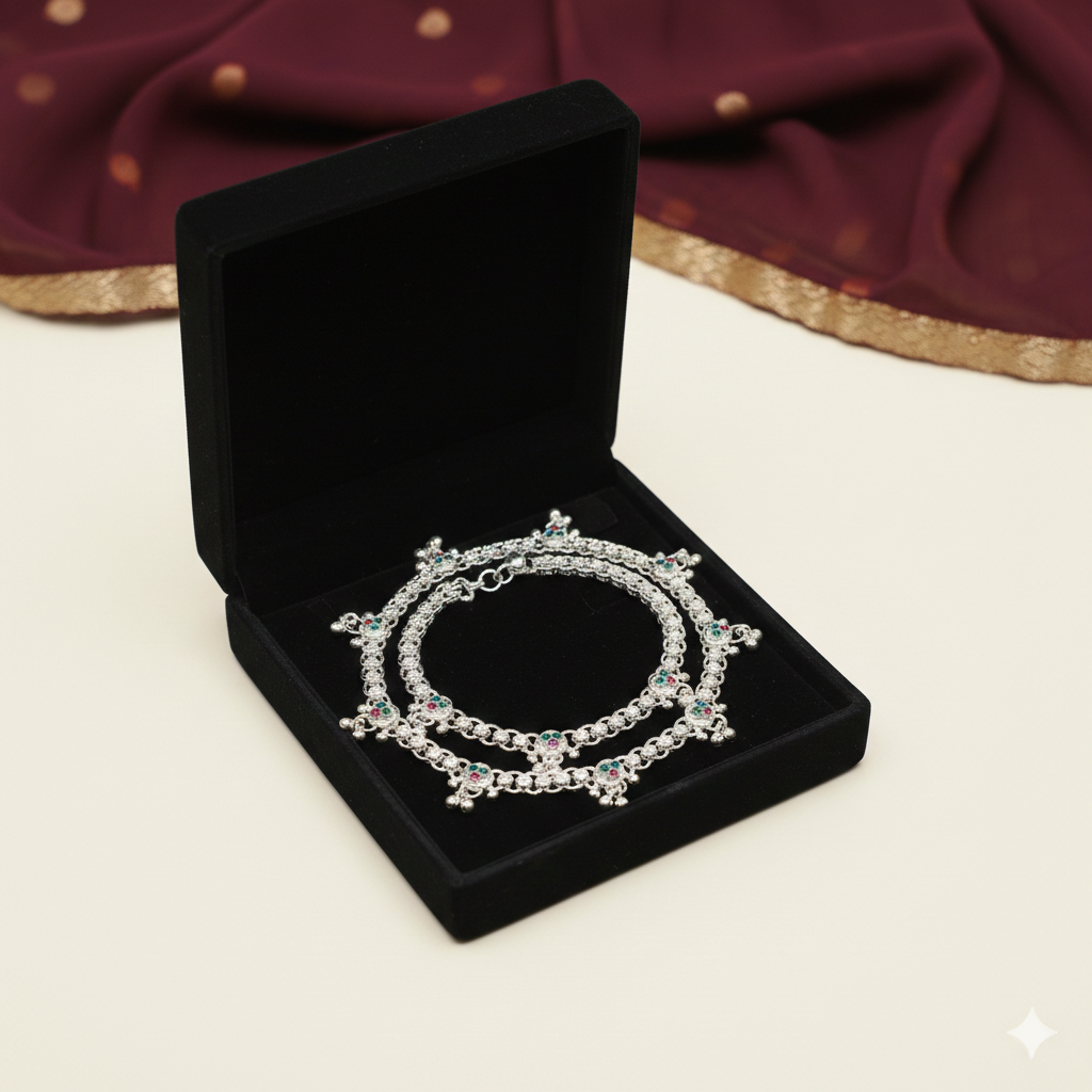 Radiate timeless elegance with this Royal Pearl & Kundan Statement Anklet. Designed for the most special occasions, this anklet combines the luster of pearls with the intricate brilliance of Kundan stonework. It is a masterpiece that celebrates traditional Indian craftsmanship with a luxurious, modern flair.